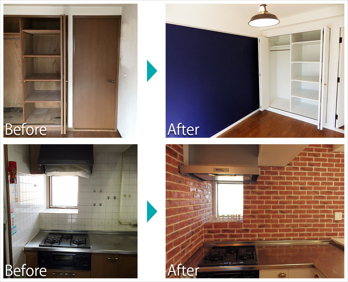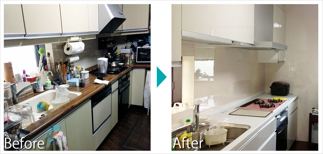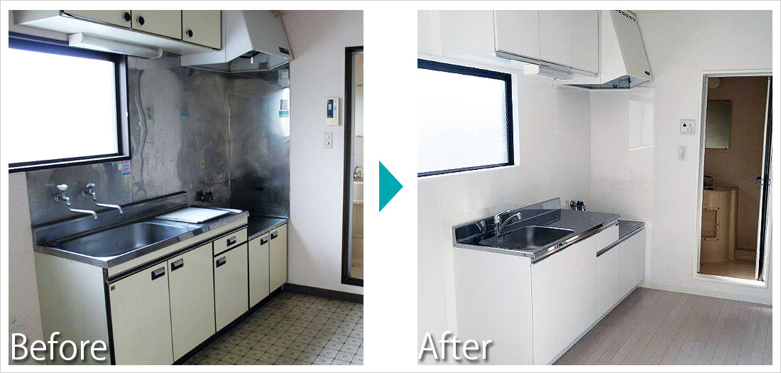 キッチン取替え・床をフローリングに変更・壁のクロス張替え(写真クリックで拡大表示)
