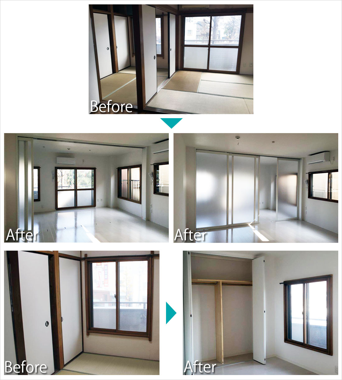 襖で仕切られた畳敷きの2間を、フローリングの洋間1間に変更。押入れをクローゼットに変更。部屋を広々と使えます。