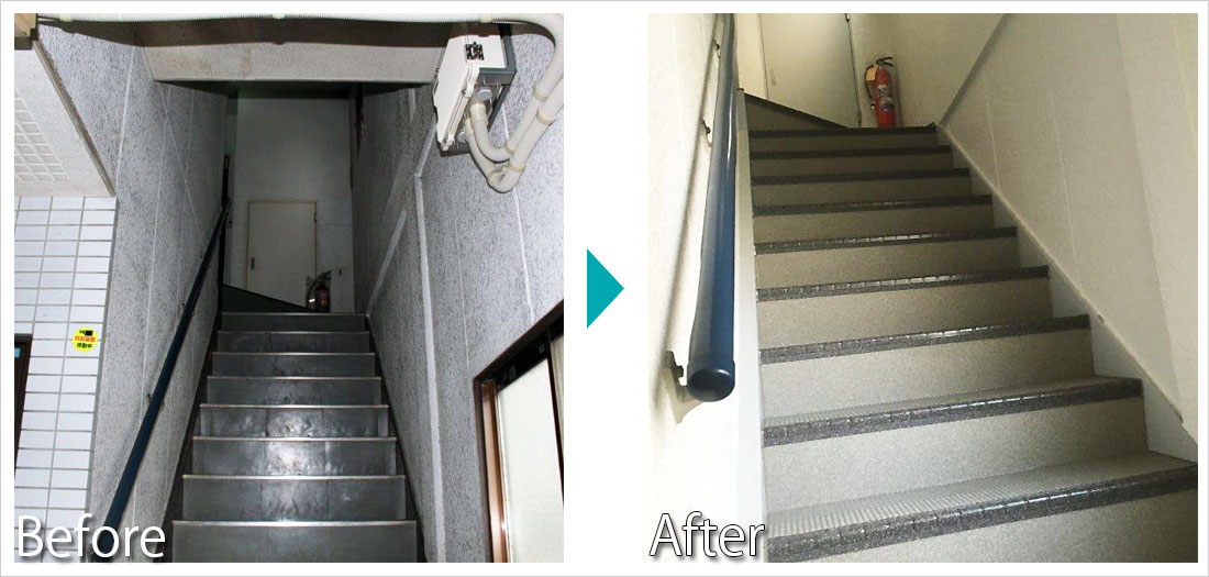 ビル内階段。壁の塗装・階段には長尺シート張りをすることで、暗かった階段が明るくなりました。長尺シートにはすべり止めや防音の効果もあります。