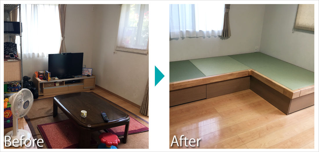 畳の下は大容量の収納スペースとなり、あふれていたお子さんのおもちゃも入ります。来客用やオフシーズンの寝具などを収納してもよいと思います。