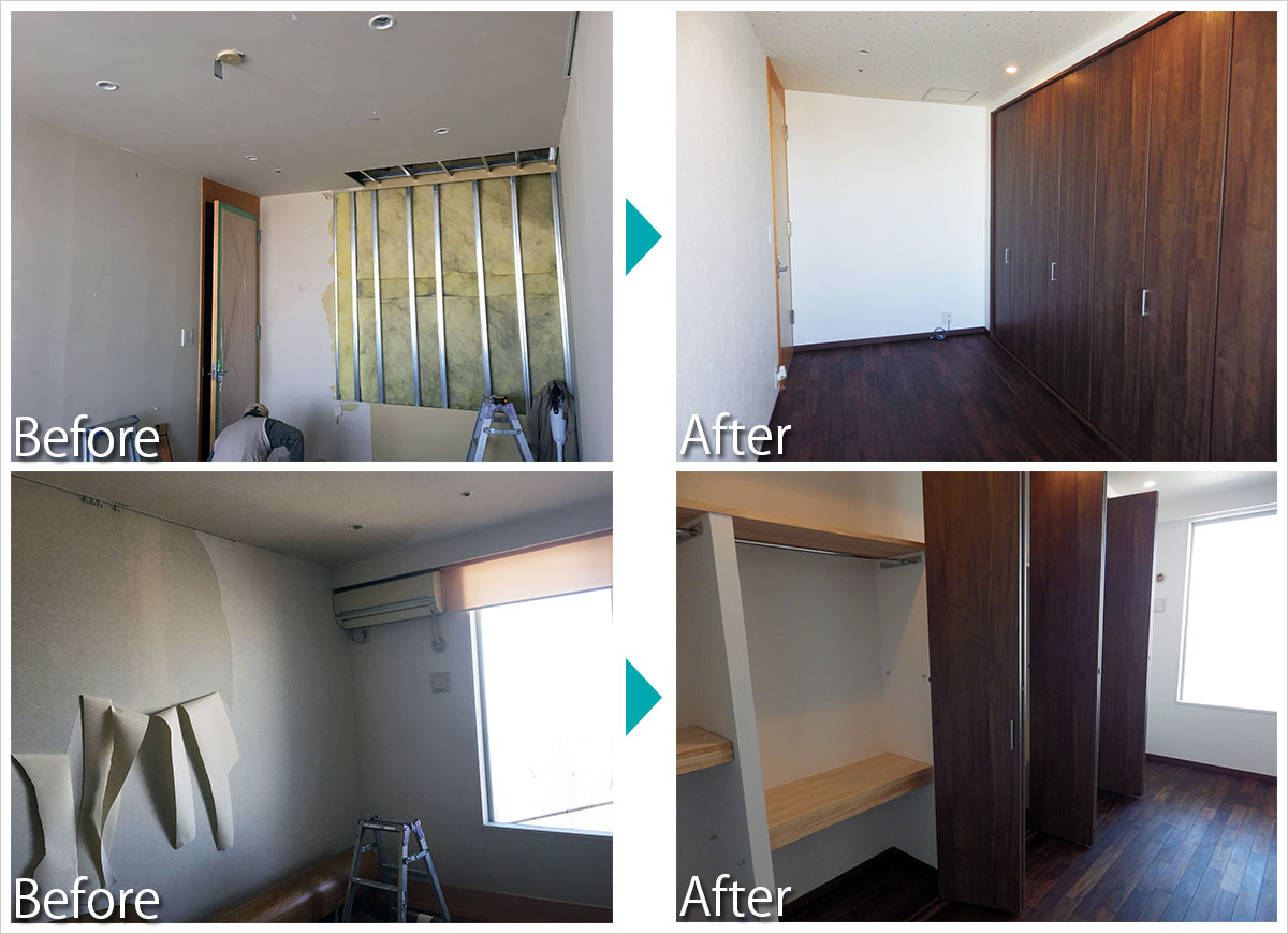 既存のクローゼットでは収納量が少なかったので、壁一面に大容量のクローゼットを設置。衣類や寝具などすべて納まります。