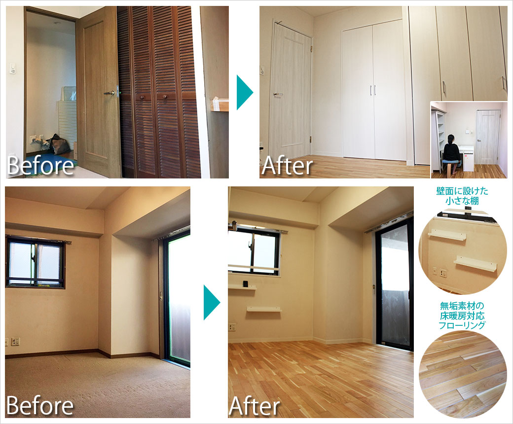 寝室とリビングに分かれていた部屋の間仕切りを解体。広く開放的な空間になりました。