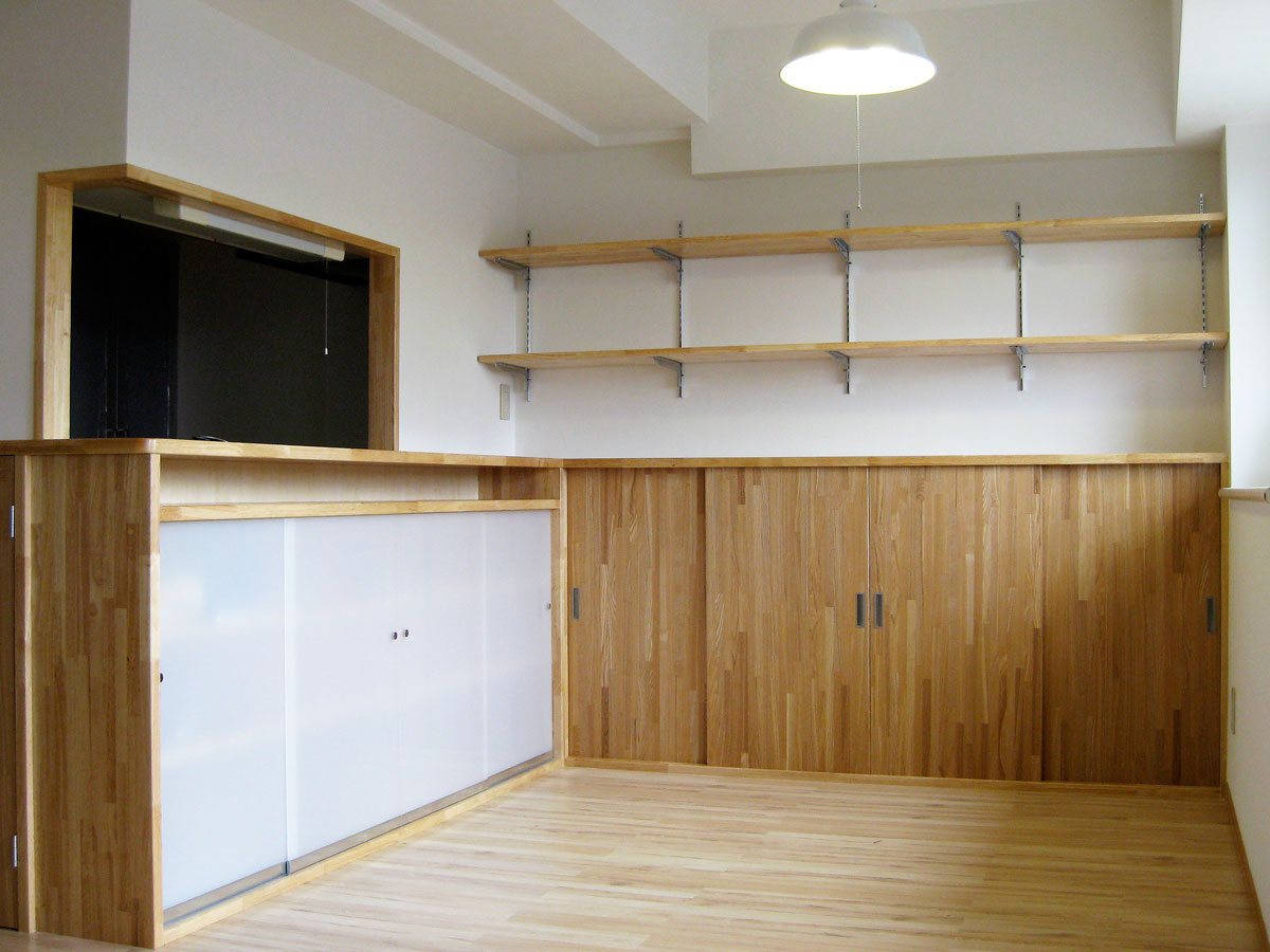 何もなかった壁面に引き戸付きの収納棚を設置。本好きな施主様のリクエストにより上部は本棚を取付けました。