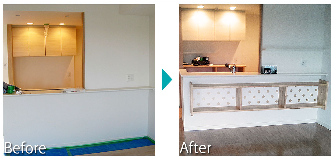 何もなかったカウンター下に収納を設置。かわいいドット柄を使いました。